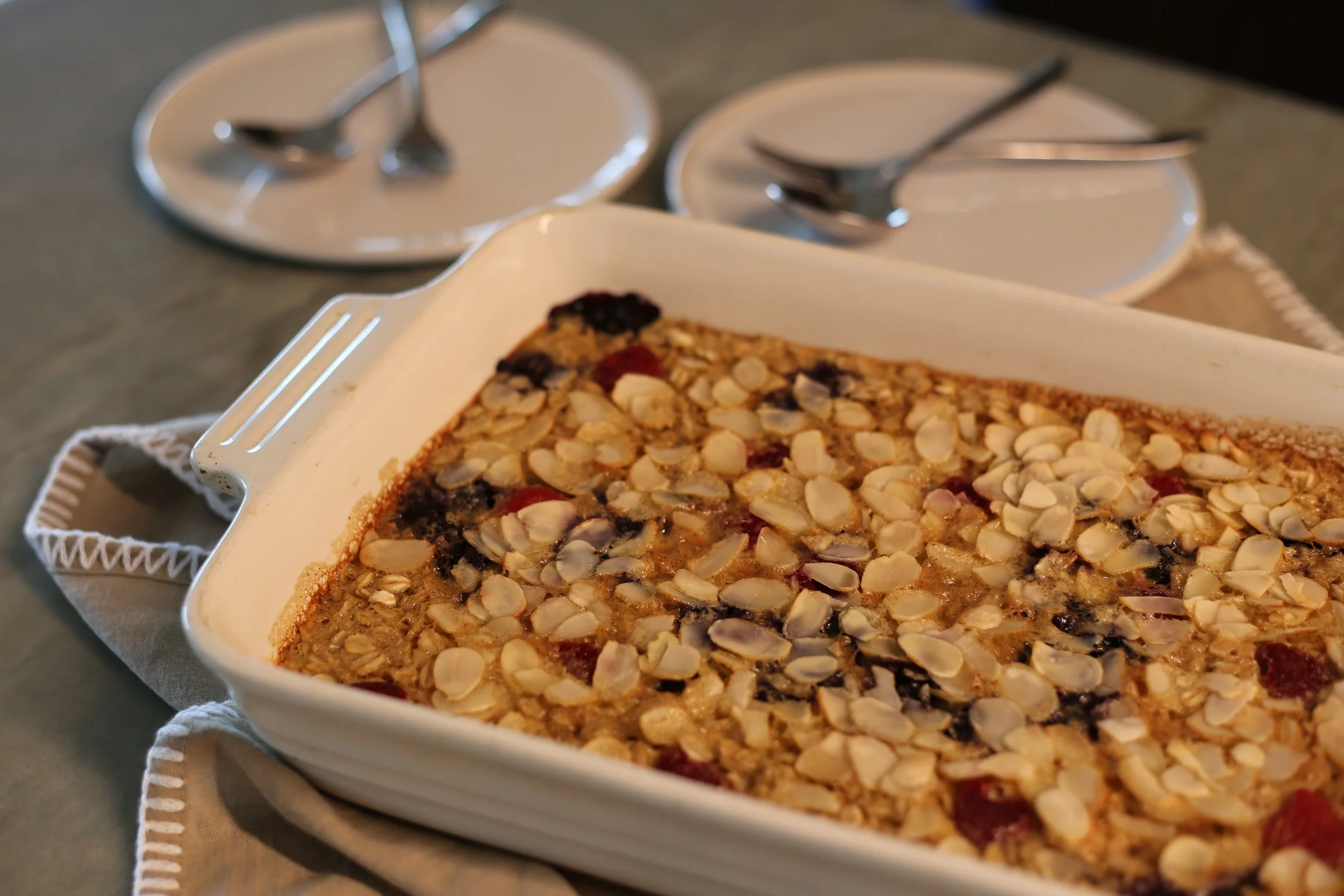 In the morning - pour wet ingredients over oats. Add berries and nuts. Whilst this is baking away in the oven you get everything else ready. Wa-la!
